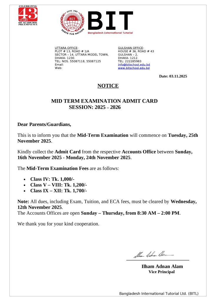 MID TERM EXAMINATION ADMIT CARD (2025 – 2026)