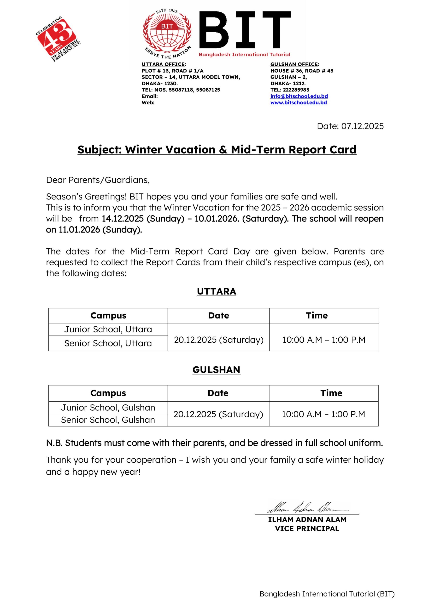 Winter Vacation and Mid-Term Report Card